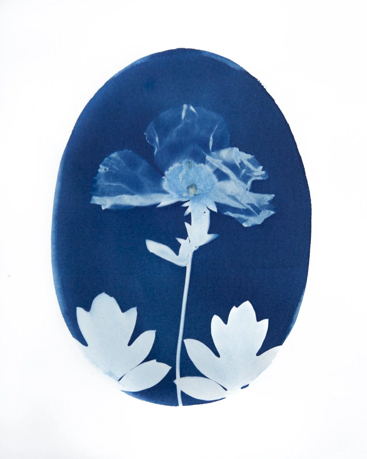 The image is taken from a high-resolution scan of an original cyanotype created on watercolor paper, preserving the depth of indigo tones and botanical detail of the handmade process.
